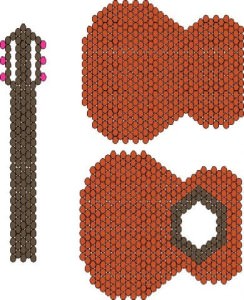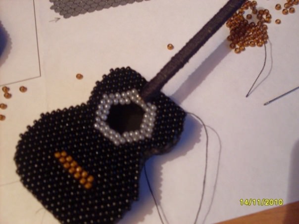16. После изготовления двух линий подставки, протяните нитку сквозь бисеринки в каждой из них, соединяя их в единое целое. Теперь передняя дека вашей гитары готова.