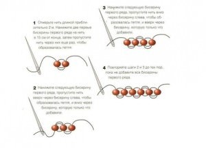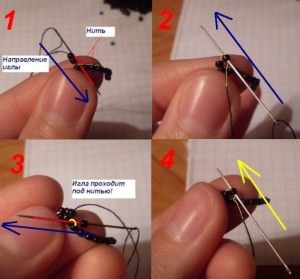 1. Вденьте оба конца вашей нити в иголки. Плести будем, используя кирпичный стежок. На схеме первый ряд изображен вертикальным столбиком от 1 до 2). Используя правую иголку нанижите 2 бисерины и расположите их посередине нити.