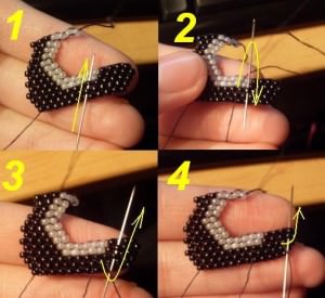 6. Добавьте одну бисеринку, и протяните иголку сквозь 1-ю бисеринку первой строчки. После этого протяните иглу сквозь соседние бисерины по линии, вытягивая ее из крайней добавленной бисерины второй строчки. Так вы должны получить две первых строчки. Обратите внимание, что бисер добавляется не всегда только в начале строчки.