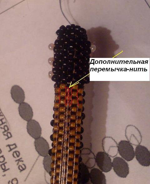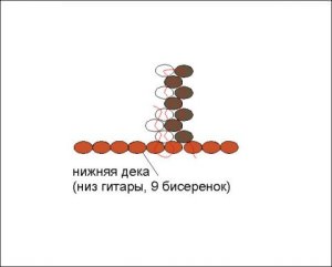 15. Параллельно делаем подставку для струн на корпусе гитары. Используя красную бусинку наметьте, где вы расположите первую коричневую бусинку. Начните плести так, как обычно плели первые ряды в других деталях этой поделки. Только тогда вы выполняли просто цепочку из бисерин, а теперь нужно плести параллельно имеющейся строчки, непосредственно на ней.
