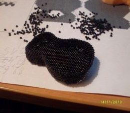 4. Дальше будет использоваться только одна игла, другую нужно пока отложить. Продолжайте плести одну из половин этой детали гитары. (Другую половину сплетете, используя оставленный конец нити). Нанижите на нитку 2 бисерины, пройдите иголкой под нитью и соедините две из последних добавленных бисеринки предыдущего ряда.