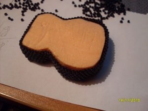 12. После завершения обечайки, начните наполнять свою гитару. В качестве наполнителя будем использовать пенопласт. Обведите на куске пенопласта свою гитару и вырежьте заготовку. Когда она легко ляжет внутрь бисерного корпуса, пенопласт нужно покрасить черной краской.