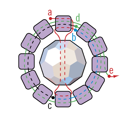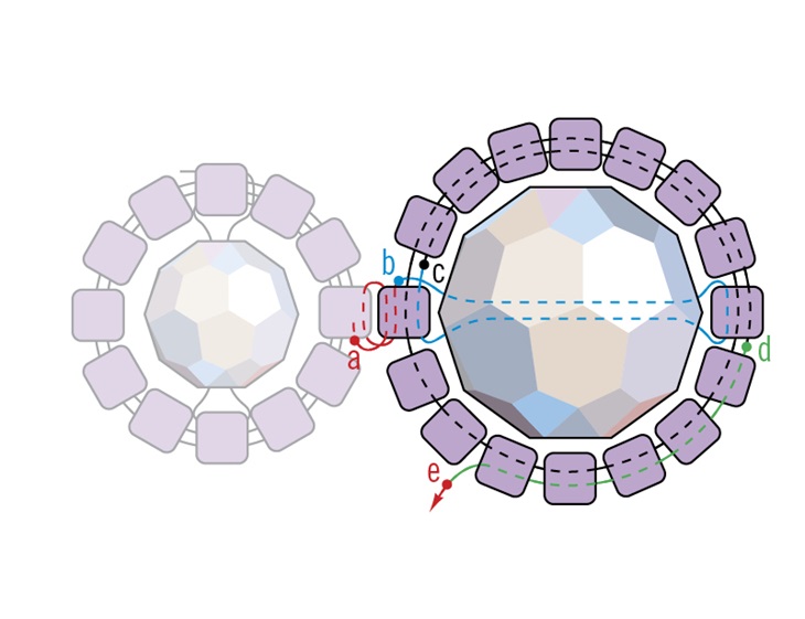 2. Возьмите пять цилиндрических бисеринок и прошейте вторую якорную бусину (см. b – c). Возьмите пять цилиндров и прошейте первую якорную бусину (см. c – d). Проведите нить еще раз через все цилиндры, чтобы укрепить кольцо. Выведите иголку через третий от первой якорной бусины цилиндр, где будет добавлен следующий кристалл Swarovski (см. D-е).