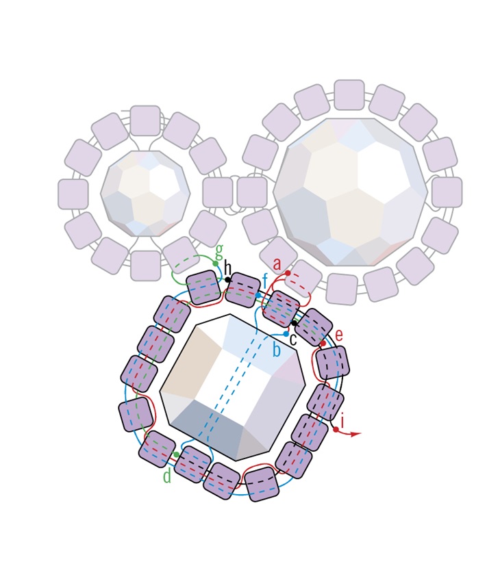 6. Определите, какой 4-миллиметровый цилиндр находится ближе всего к цилиндру, из которого вышла нить, и сшейте эти цилиндры квадратным сечением (см. g – h). Прошейте цилиндры вокруг кубического кристаллаа Swarovski и выйдите из цилиндра, с которым соединится следующий кристалл Swarovski (см. h – i).