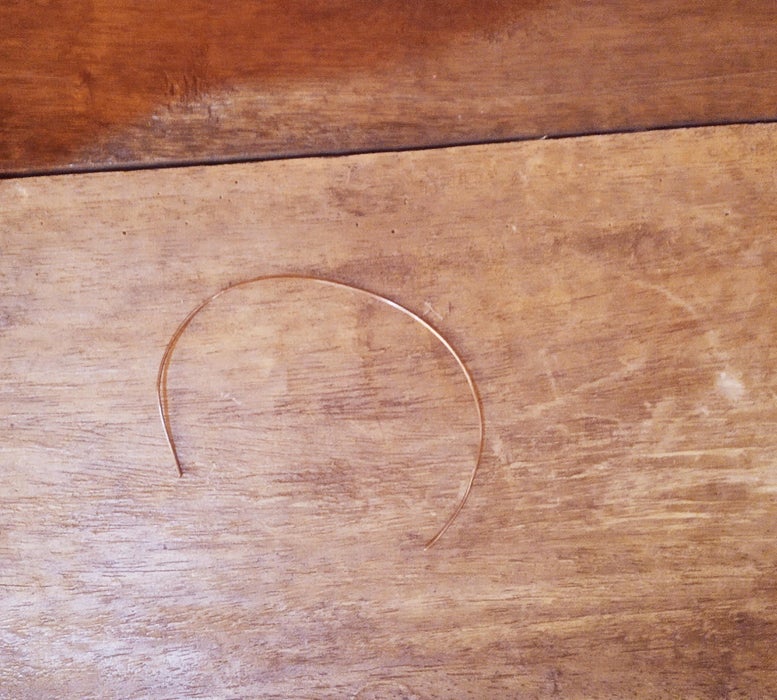 Возьмите более толстую ювелирную медную проволоку (мы использовали провод диаметром 0,8 мм), сделайте из нее круглую форму, намотав два витка с помощью любого цилиндрического предмета (мы использовали крышку для бутылки – см. фото). Диаметр витков делайте на свое усмотрение – это будет диаметр непосредственно вашего кулона. Обрежьте проволоку, чтобы получилось ровно два витка плюс по 1 см на каждом из концов.