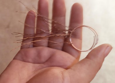 Возьмите 8 одинаковых отрезков более тонкой медной проволоки (мы использовали провод диаметром 0,2мм) длиной около 15 см. Согните их пополам и прикрепите к круговой петле, скручивая их концы между собой, как изображено на фото. После закрепления проволочных отрезков на кольце, скрутите их все вместе в подобие свободного жгута (см. фото) – мы сформировали ствол нашего дерева.