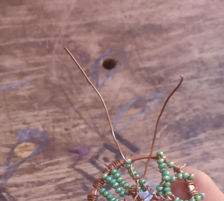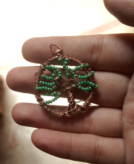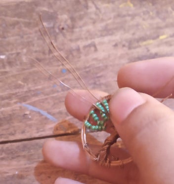 Теперь вам нужно нанизать бусинки на каждый из концов проволоки и затем обернуть их вокруг круговой петли, последовательно и равномерно распределяя места их крепления – таким образом, чтобы сформировать ветки своего дерева, как изображено на фото.