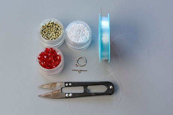 наденьте четыре белых бисерин на леску, затем замочек-тогл, и снова четыре белых бисеринок. Протяните леску через золотистую бисерину, чтобы образовалась небольшая петля. Сделайте несколько узлов и отрежьте лишнюю леску.