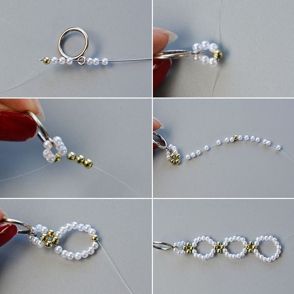 протяните леску через золотистую бисеринку, затем наденьте на нее 5 белых бисерин. Пройдите через верхнюю золотистую бисерину, затем наденьте две новые белые бисерины на леску;
