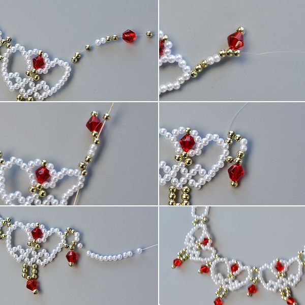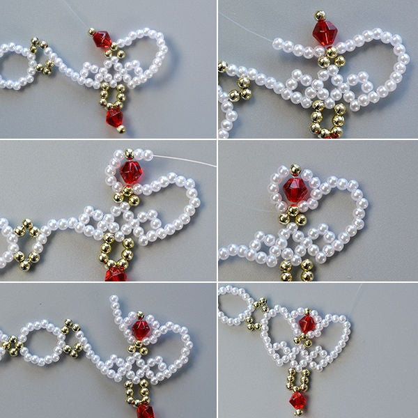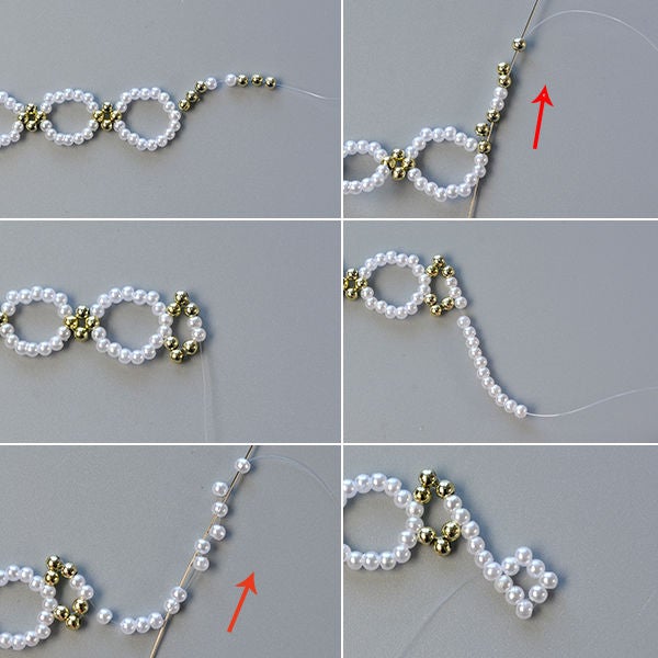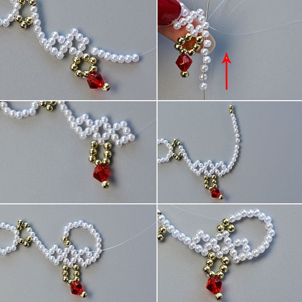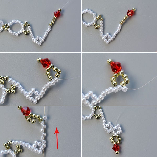 протяните леску назад через красную бусинку, затем наденьте 3 золотистых бисеринки, протяните леску через белую жемчужную бисерину, чтобы замкнуть петлю;