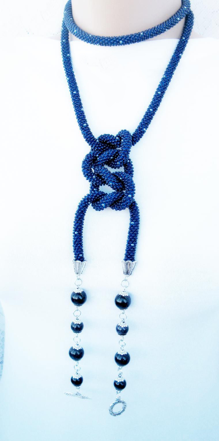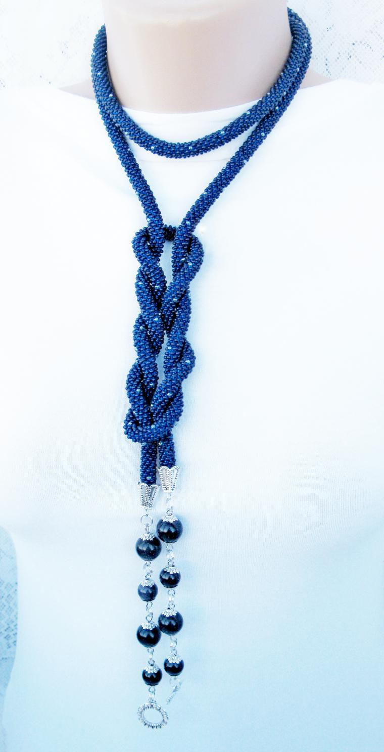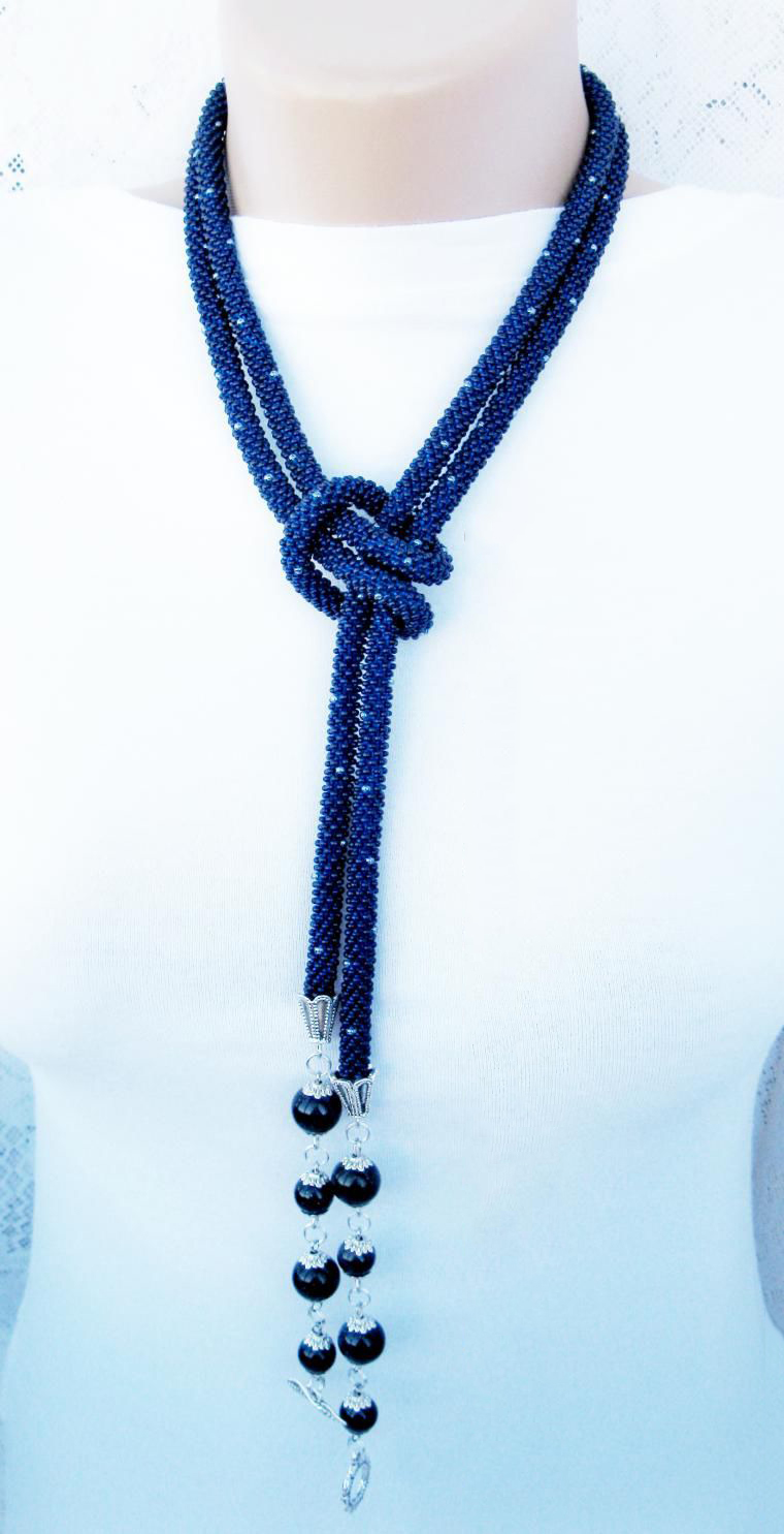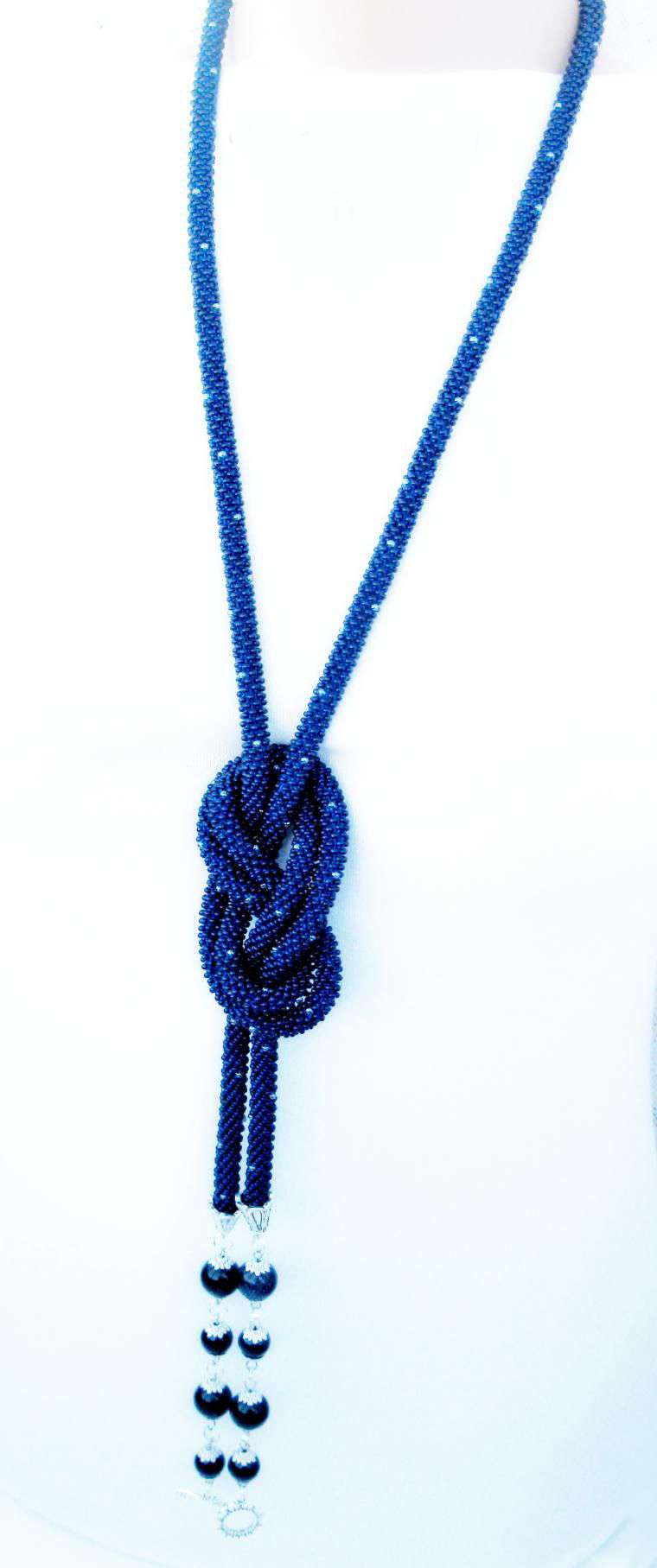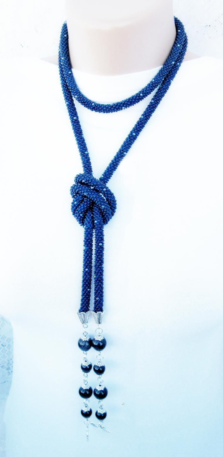 В нашем случае это будет бисерный жгут с гранеными подвесками. Плетеная часть этого аксессуара равна примерно 125 см, а подвески достигают 10 - 15 см в длину. Таким образом общая длина представленного здесь лариата составляет около 145 см.