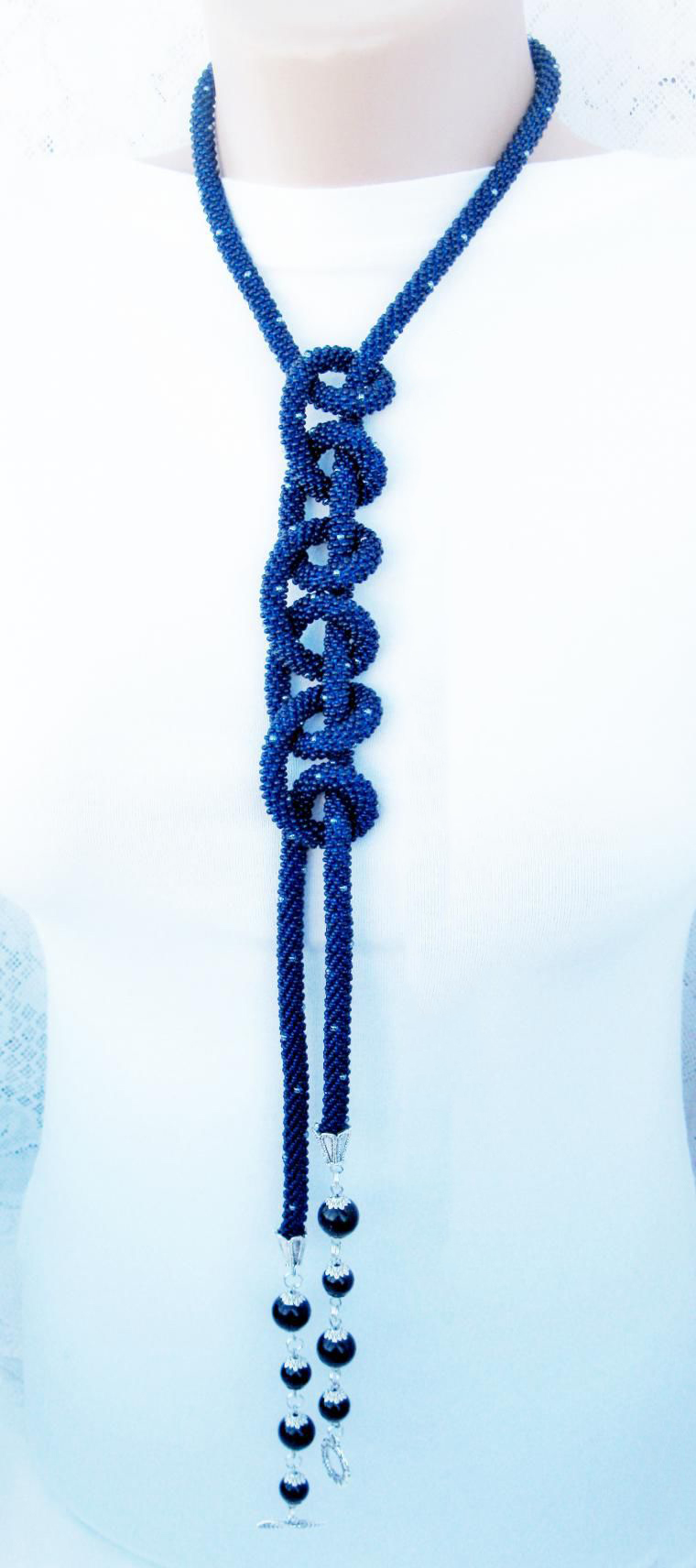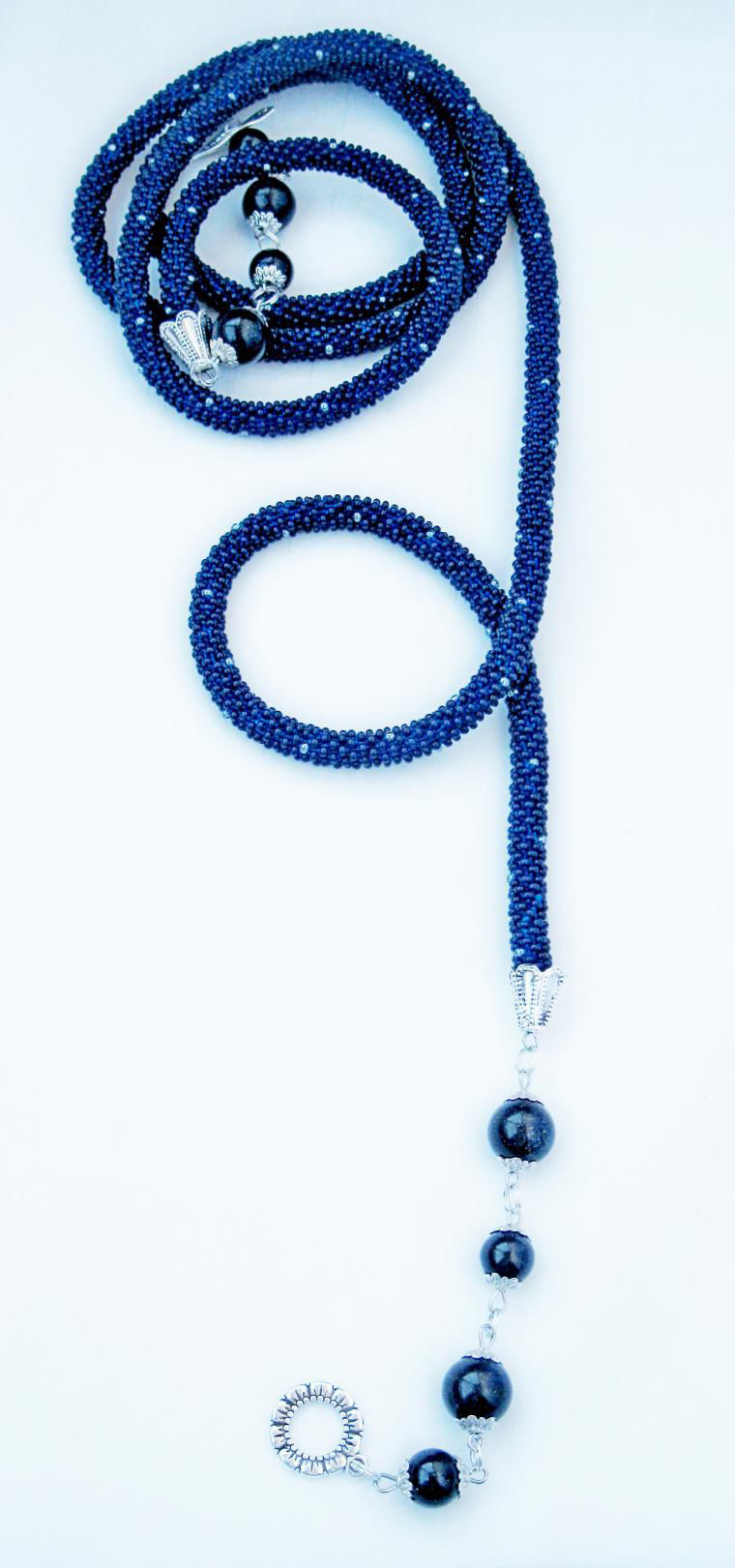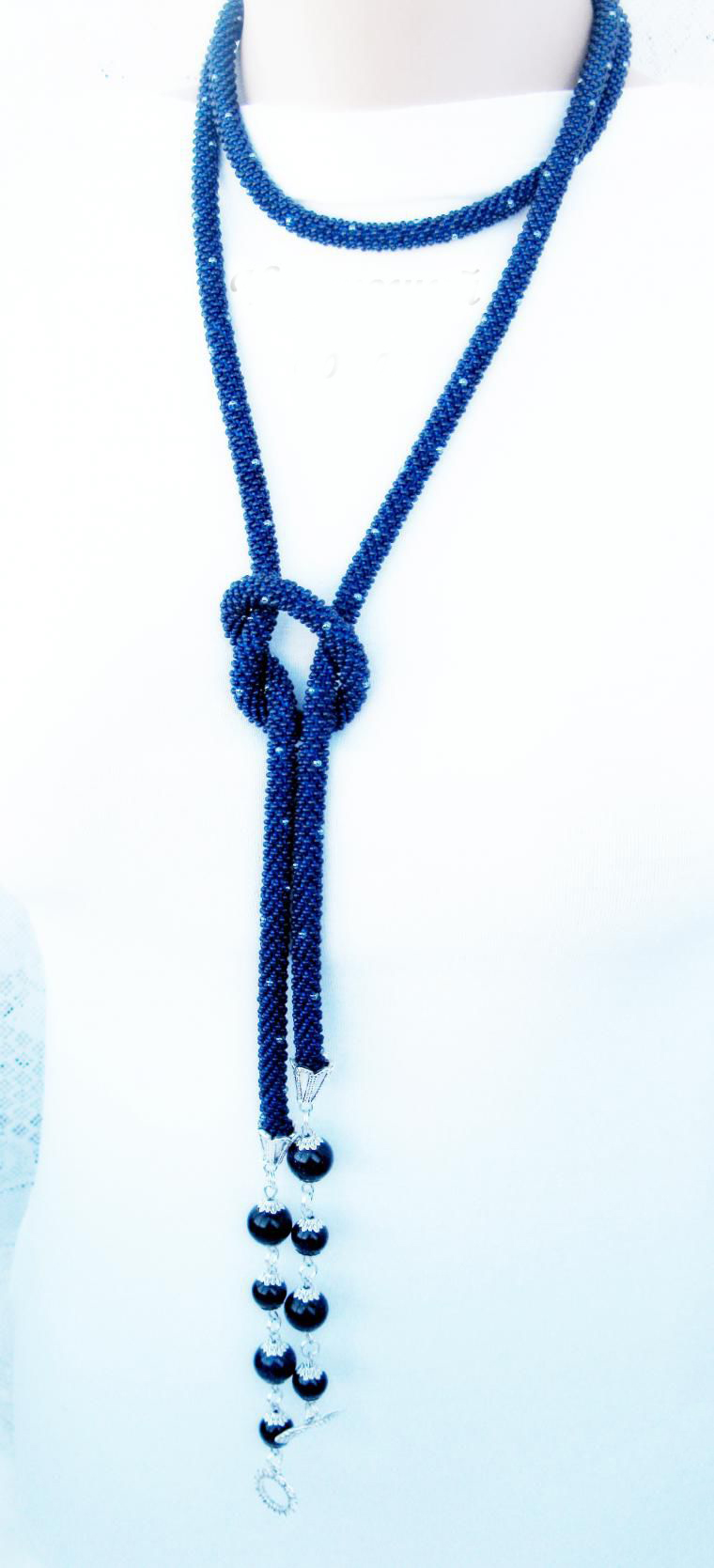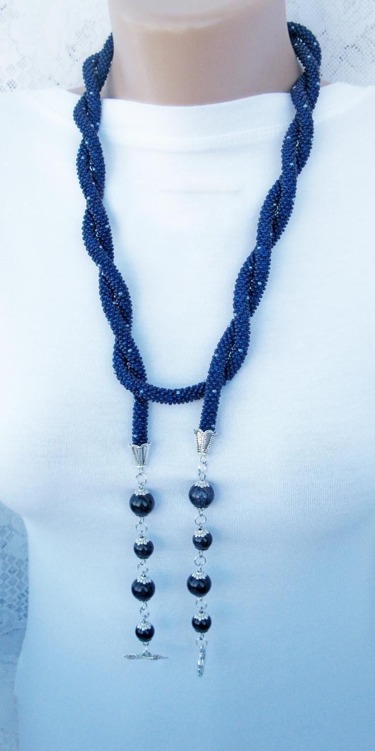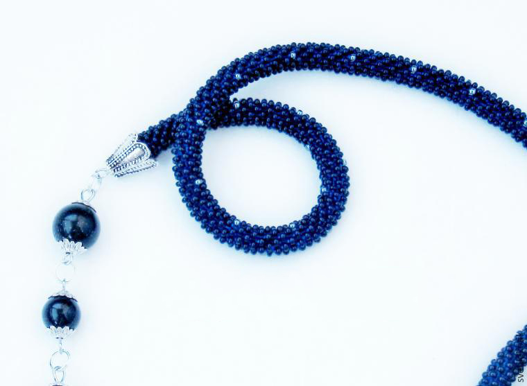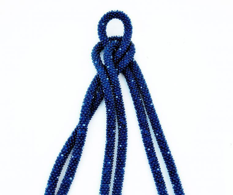 В нашем случае это будет бисерный жгут с гранеными подвесками. Плетеная часть этого аксессуара равна примерно 125 см, а подвески достигают 10 - 15 см в длину. Таким образом общая длина представленного здесь лариата составляет около 145 см.