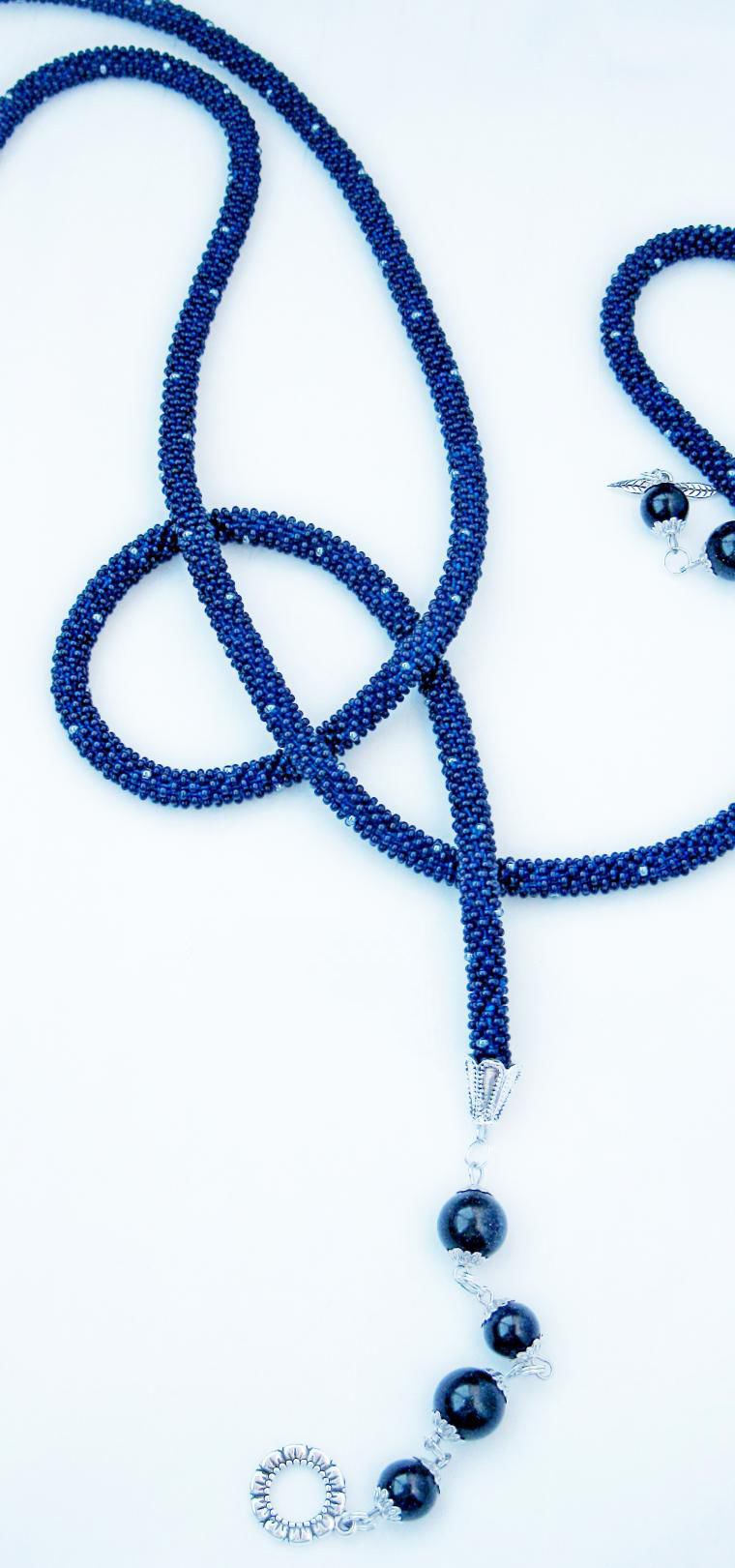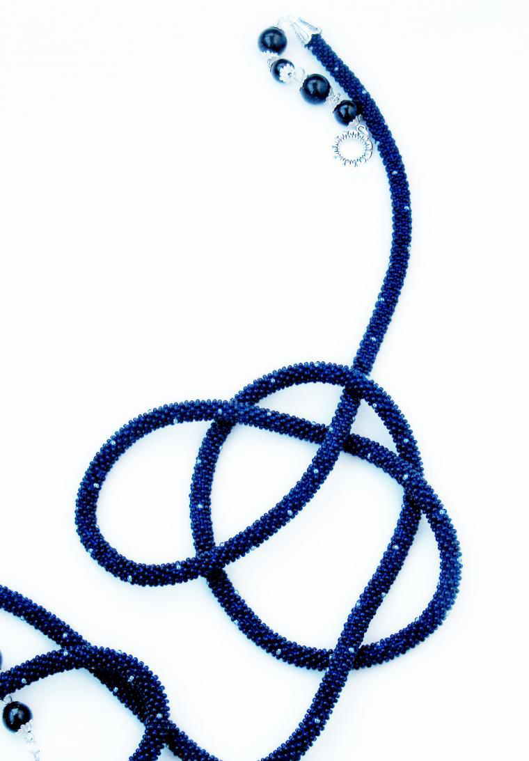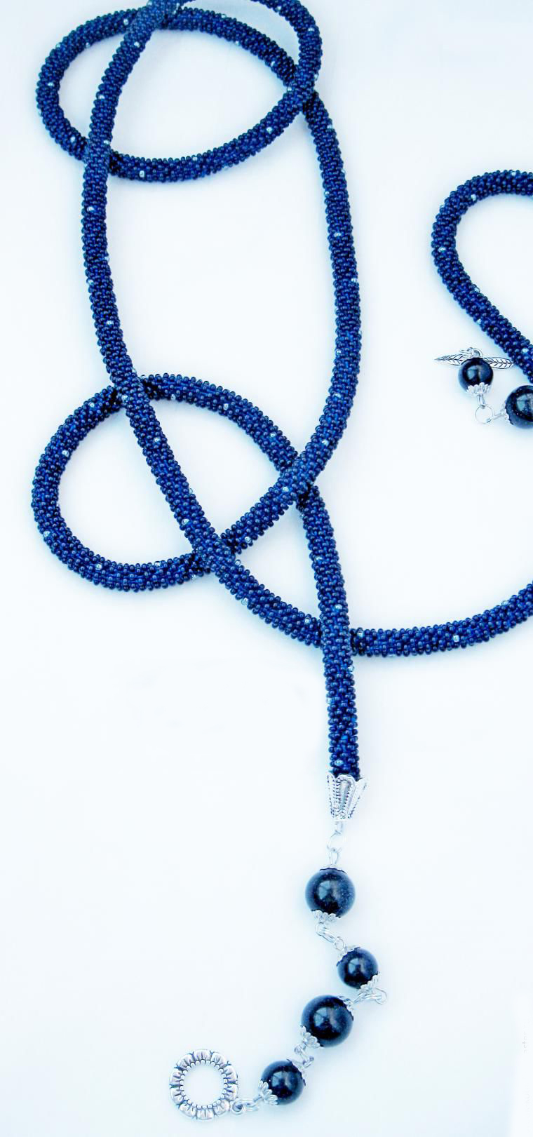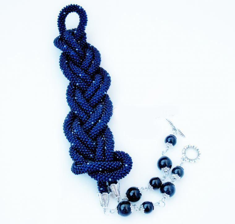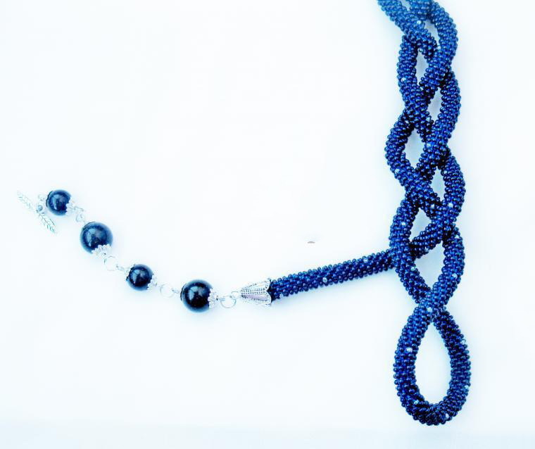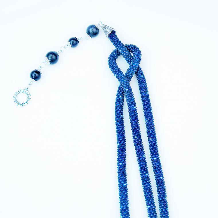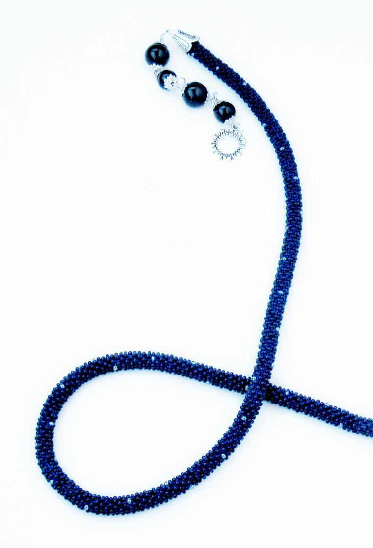 В нашем случае это будет бисерный жгут с гранеными подвесками. Плетеная часть этого аксессуара равна примерно 125 см, а подвески достигают 10 - 15 см в длину. Таким образом общая длина представленного здесь лариата составляет около 145 см.