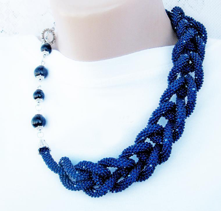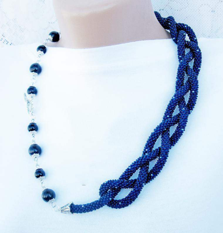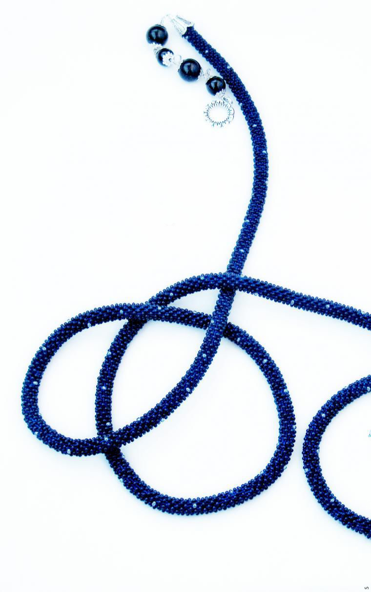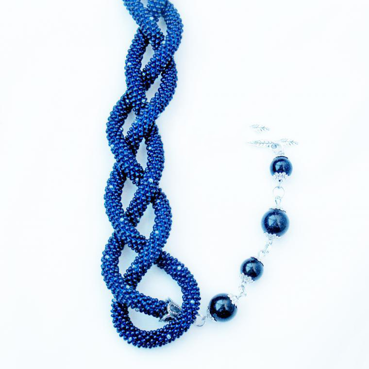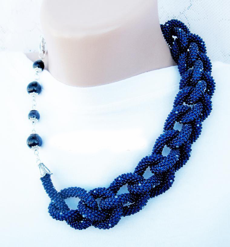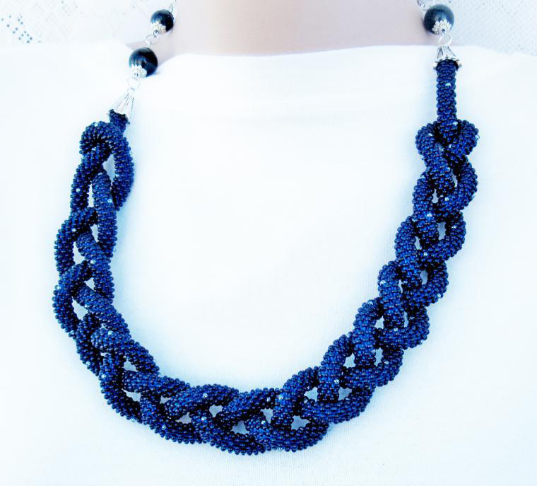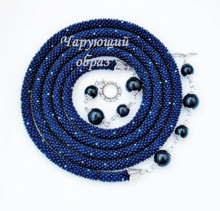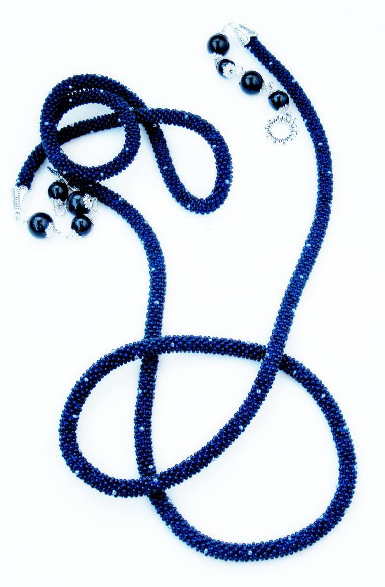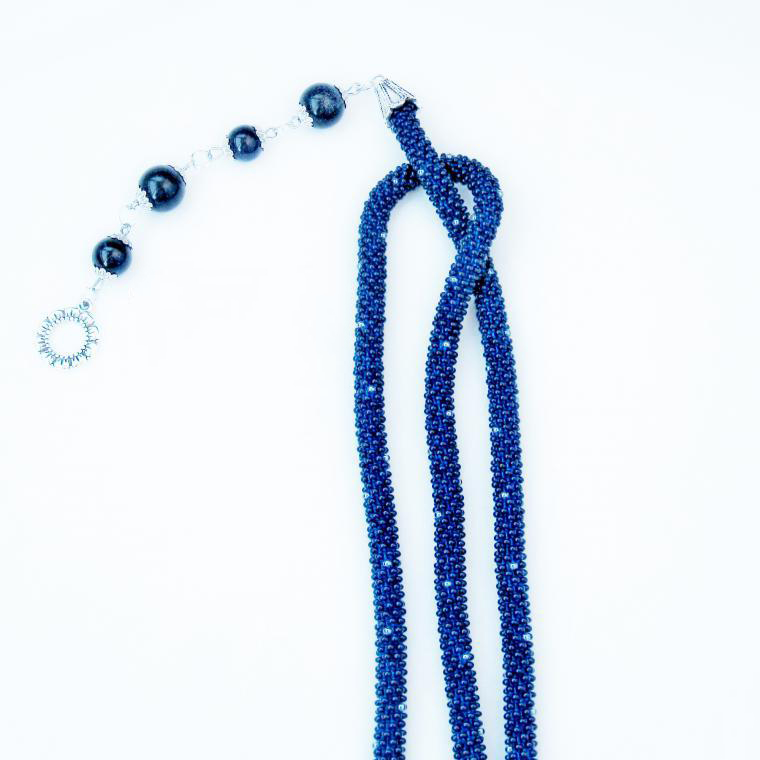 В нашем случае это будет бисерный жгут с гранеными подвесками. Плетеная часть этого аксессуара равна примерно 125 см, а подвески достигают 10 - 15 см в длину. Таким образом общая длина представленного здесь лариата составляет около 145 см.