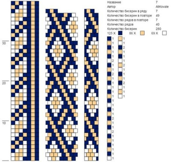 Обычно рабочей схемой называют самую большую картинку, в соответствии с которой и производится нанизывание бисеринок. Узенькие схемы, расположенные рядом с основной, отражают внешний вид завершенного жгута. Первая цифра, расположенная в верхнем правом углу стандартной схемы, обычно означает число бисеринок в одном ряду.