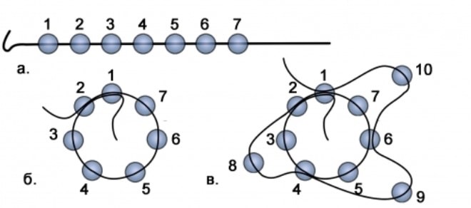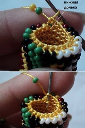 Например, наиболее распространенными являются вязание крючком с использованием нанизанных на нитку бисеринок и нанизывание бисеринок на леску посредством длинной иголки по заданной схеме плетения.