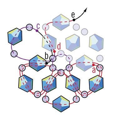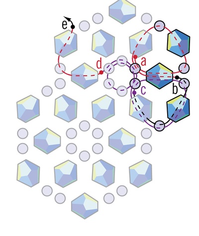 6. Повторите шаг 2 (см. РИСУНОК 6, a – b). Возьмите на иголку бисеринку 15/0, биконический кристалл Swarovski и снова бисеринку 15/0 и прошейте следующие внешние биконические кристаллы Swarovski из первого кристаллического фрагмента (см. b – c). Нанижите бисерину 15/0 и прошейте все бусинки, добавленные на этом этапе. Укрепите новое центральное кольцо из бисерин 15/0 (см. c – d). Далее прошейте кристаллический биконус Swarovski, бисеринку размера 15/0 и опять биконус Swarovski, чтобы добраться до внешнего края кристалла (см. d – e).