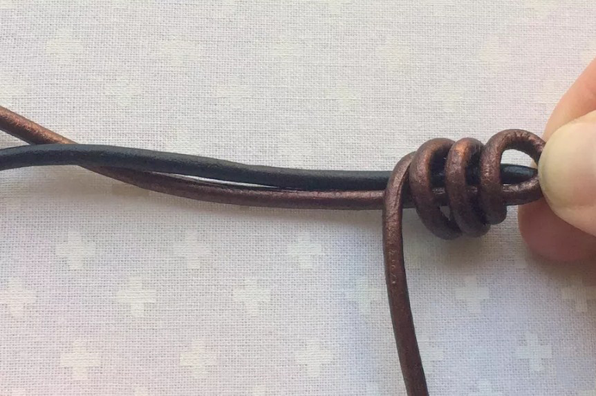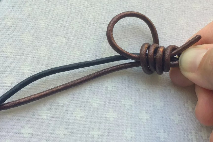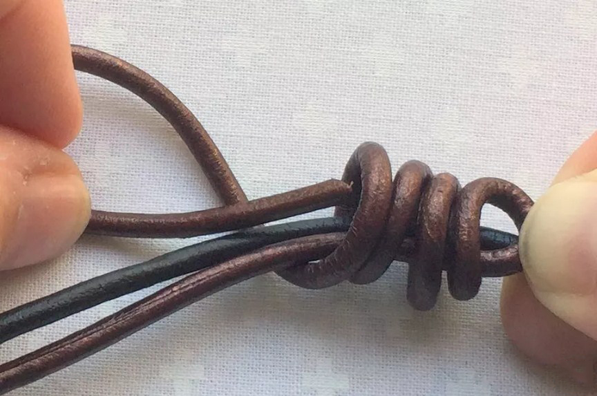 Этот шаг будет намного проще выполнить на более жестком шнурке, аналогичном изображенному на фотографии кожаному шнурку диаметром 2 миллиметра. Использование гибкого шнурка усложняет прохождение через центральные петли. В таком случае просто наберитесь терпения.