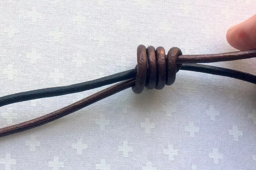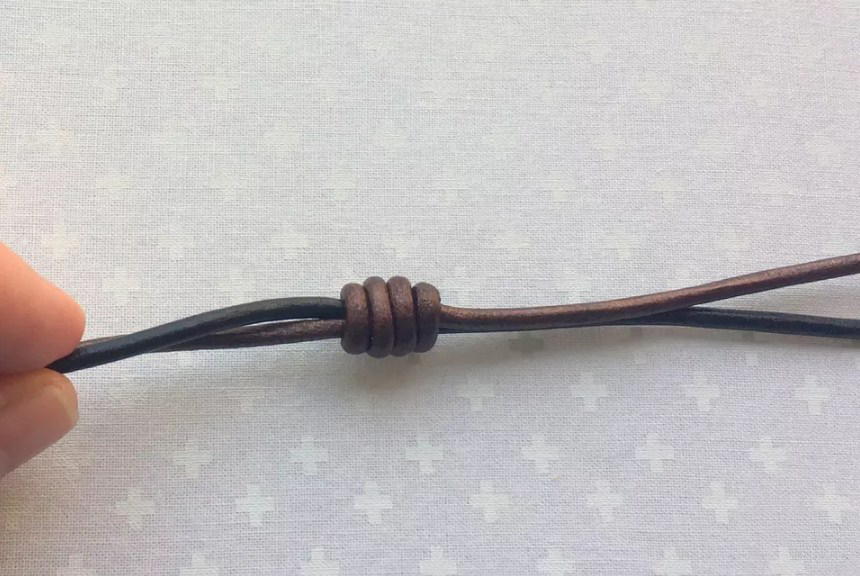 Лучше всего этот элемент работает в качестве регулируемого замочка, в котором используются оба конца корда, на котором собран браслет или бусы. Для этого вам будет нужно сделать два скользящих узла – на двух концах основы украшения. (см. фото).