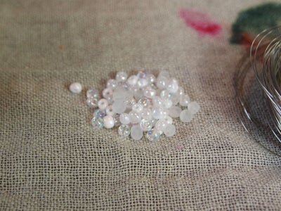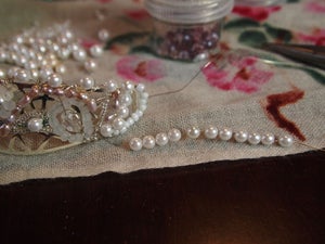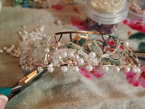 Мы начали оплетку с нижней части ободка, используя жемчуг среднего размера. Мы прикрепили его с помощью ювелирной проволоки, постепенно нанизывая его один за другим и стараясь размещать его равном расстоянии. Мы на этом этапе использовали более толстую проволоку, которую изгибали и выравнивали с помощью плоскогубцев. Так же с их помощью мы тщательно сплющивали концы проволоки и прижимали к изделию, чтобы в нем не было острых краев.
