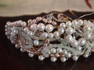В начале ряда нанижите длинную низку белых бусинок (см. фото). Затем продолжайте, приплетая несколько матовых бусин в форме слезы. Мы добавили большую прозрачную бусинку посередине. Затем возвращаемся к первому набору белых бусинок и нанизываем один ряд со средним жемчугом, а затем с более мелкими розовыми жемчужинами. Что бы вы ни решили сделать, постарайтесь, чтобы узор был равномерным и максимально согласованным. Если вы используете определенный вид бусинок, а потом в следующем ряду их меняете на другие, старайтесь, чтобы получившийся рисунок проходил по всей длине ободка, до конца ряда.