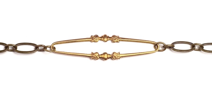 2. В каждом отрезке определить середину и присоединить в этом месте декоративные элементы. Их можно подвешивать прямо к цепочке. Или разъединить звенья по центру и вставить любой винтажный элемент.