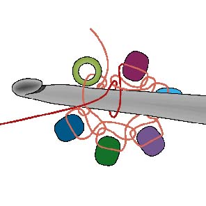 10. Зацепите пряжу крючком и протяните ее через петлю. Так мы завершили второе звено цепочки с бисером.