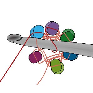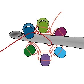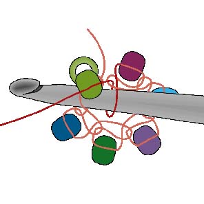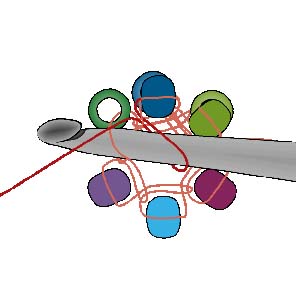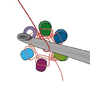37. Подведите рабочую нить между пятой (бирюзовой) и шестой (фуксия) бусинами первого круга и над петлей на крючке.