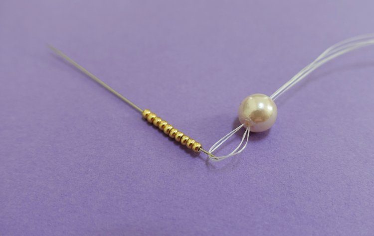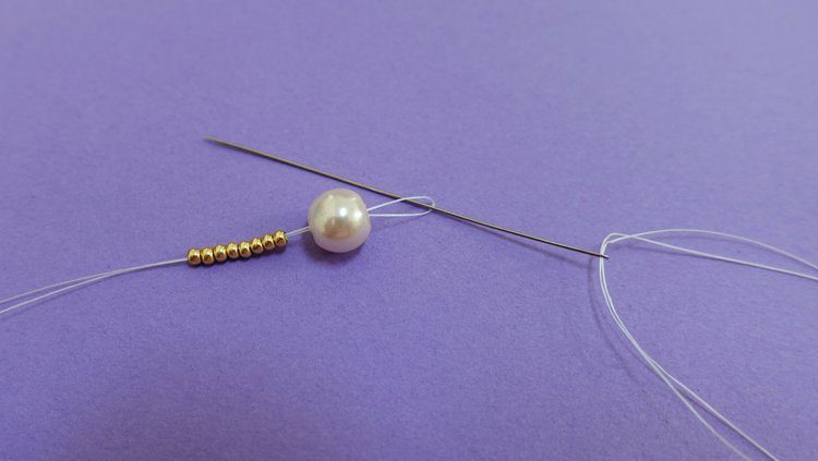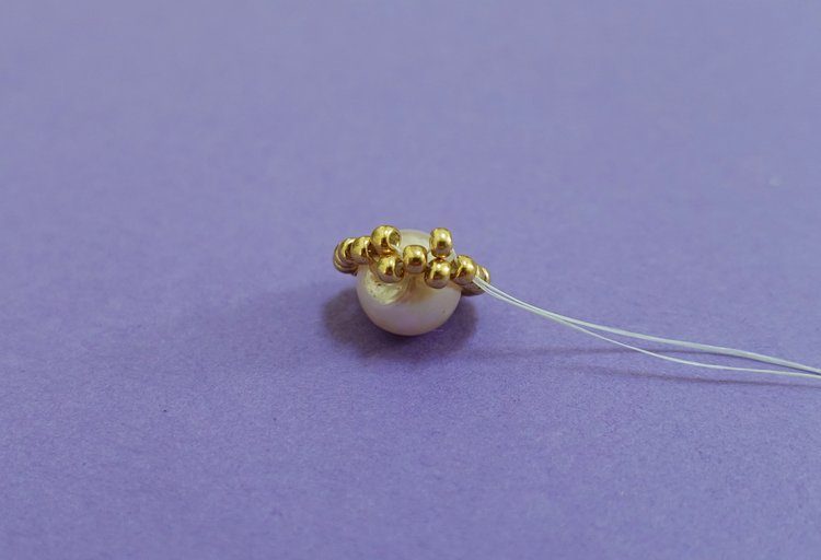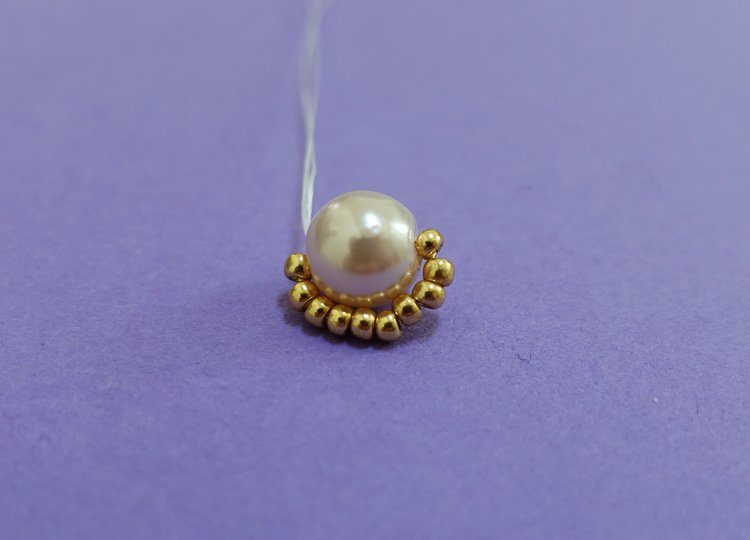 2. Наденьте жемчужину, затем достаточное количество бисера 11-го размера, чтобы обернуть жемчужину примерно наполовину ее окружности. Будьте осторожны, чтобы они не соскользнули с конца нити. Вам понадобится только пара попыток, чтобы выяснить правильное количество бисеринок. Используйте одно и то же их число с обеих сторон жемчужины, чтобы убедиться, что в итоге вы получите четное количество бисера.
