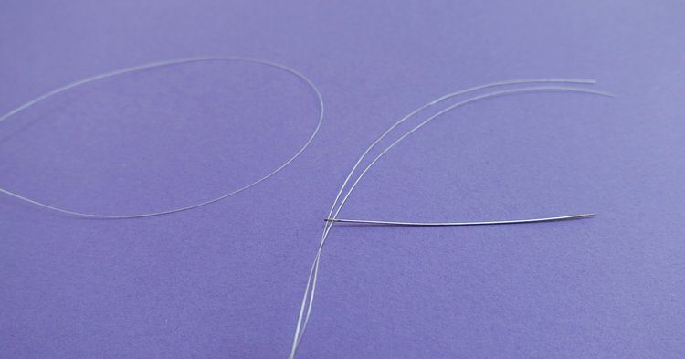 1. Отрежьте длинную нить, которую нужно сложить вдвое. Проденьте оба ее конца через иглу, оставив петлю на другом конце.
