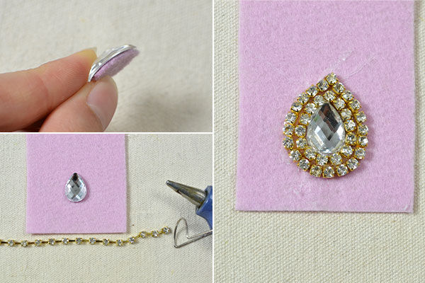 3. На фетре закрепить вторую бусину из горного хрусталя и обвести ее стразовой лентой. После высыхания обрезать аккуратно ножницами по контуру. С изнаночной стороны приклеить застежку гвоздик.