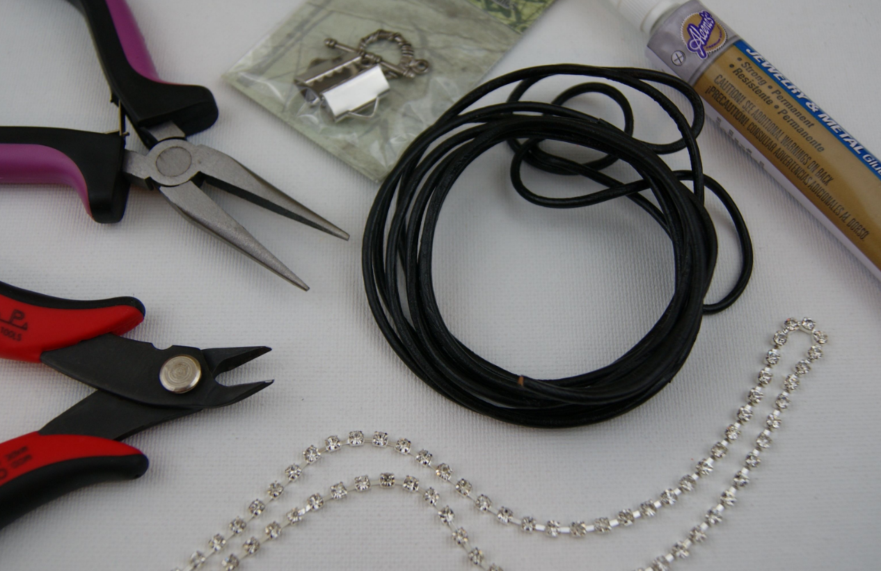 1. Измерить длину запястья. Отрезать шнур, стразовую цепочку, длина которых немного больше. Нити понадобится раза в три больше, чем длина остальных деталей. Для изготовления двух браслетов подготовить 2 отрезка стразов и 3 кожаных шнурка. Готовый браслет не должен плотно облегать руку. Застежка тогл требует немного запаса длины.