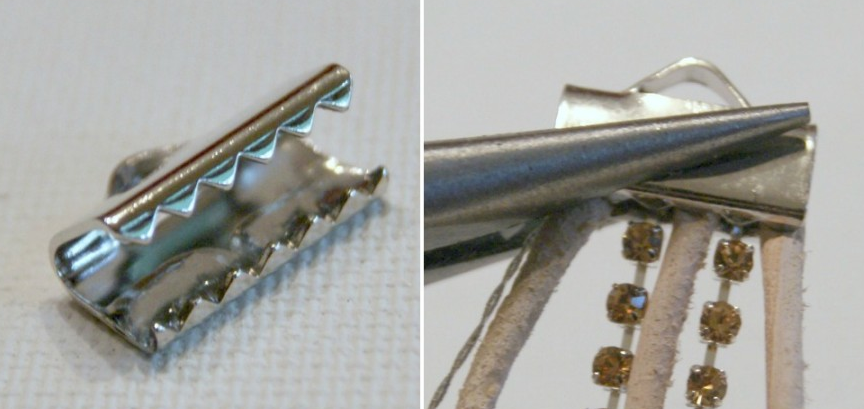 2. В концевике закрепить все, что потребуется для дальнейшей работы. Это три шнурка, две цепочки из стразов и нить. На внутреннюю поверхность нанести небольшое количество клея, затем закрепить все детали при помощи круглогубцев или плоскогубцев.