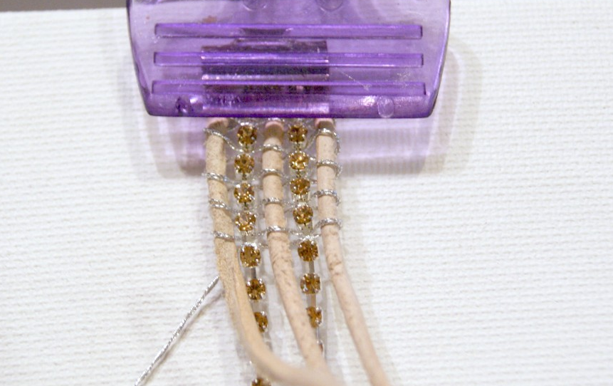 3. Закрепленной нитью обвить сначала один из шнуров, завязав узелок. Затем поочередно обвивать все детали, как это показано на фото. Стараться, чтобы все нити шли параллельно и занимали свободное пространство между стразами.