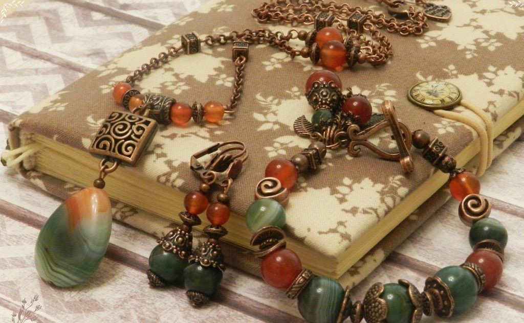 Эта простая техника позволяет изготовить целый комплект, состоящий из модных ожерелий с браслетами и серьгами. Подобные украшения гармонично украсят ваш модный образ, будь то стиль ориентал, бохо-шик, этно, хиппи либо кантри. Достаточно равномерно распределить их на шее – и ваше колье готово.