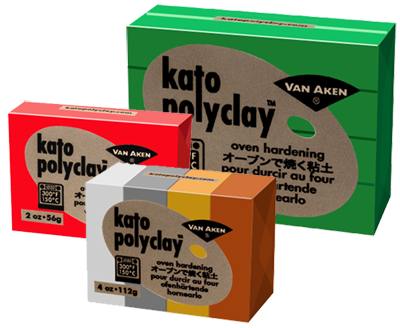 Kato Polyclay – пластика американского производителя, запекается при самой высокой температуре по сравнению со всеми остальными сортами (150о). Также она обладает значительной твердостью и разминается с помощью молотка. Благодаря своей твердости, Kato очень подходит для колбас: она хорошо фиксирует тонкие линии и не дает перемешиваться тонким слоям. Кроме твердой пластики, компания Kato выпускает еще и жидкую пластику Kato Liquid Polyclay. Ей присущи высокая прочность в сочетании с гибкостью: обожженные изделия можно резать ножницами на нужные формы. Бывает прозрачной и цветной. В палитре - шесть ярких прозрачных цветов и два матовых, которые легко смешиваются между собой и с декоративными добавками (например, порошком слюды или блестками). Из нее получаются изумительные витражи и мозаики, а также эффекты стекла, камня и акварели. Ее часто используют как клей, затирку, а также глазурь.