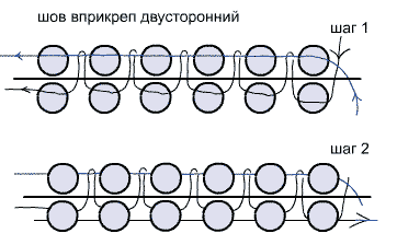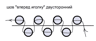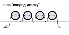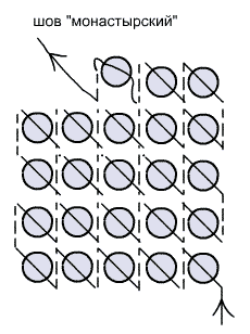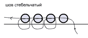 Такое шитье получается из комбинации двух описанных выше стежков: строчного со стебельчатым. В результате получается довольно-таки жесткая вышивка. Техника его выполнения отображена на рисунке: