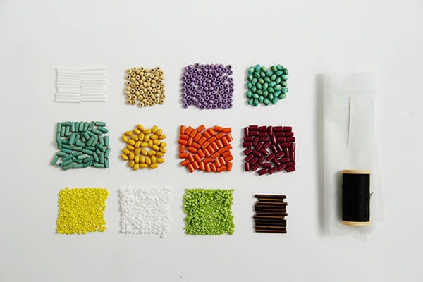 В данном проекте мы используем бусины, бисерины и стеклярус, соответствующий расцветке блузки.