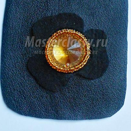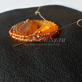 7. После этого обшейте кабошон по окружности бисером «тёмное золото»: нанижите 2 бисеринки и пришейте их. Затем выведите иглу между этими пришитыми бисеринами, пройдя иглой через вторую бусинку. Далее снова наберите две бисеринки и повторите действия.