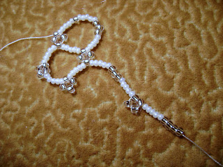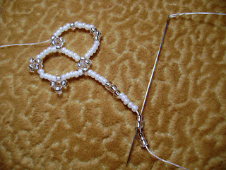 8. Дальше сделайте еще ряд (ориентируйтесь на фотоснимок, на нем этот ряд уже немного пройден). Делается это так: игла продевается справа налево сквозь две бусины в нижнем ряду. Затем набираются две бусинки, и игла снова проходит сквозь две бусинки нижнего ряда, а затем сквозь две верхние, что были набраны только что. Потом опять набираются две бисеринки, иголка проходит сквозь две нижние, что располагаются под ними. После чего снова проходит сквозь две верхние. Таким образом доходим до конца ряда. Завершив его, протяните нитку сквозь весь последний (верхний) ряд спрячьте кончик нити на изнаночной стороне работы.