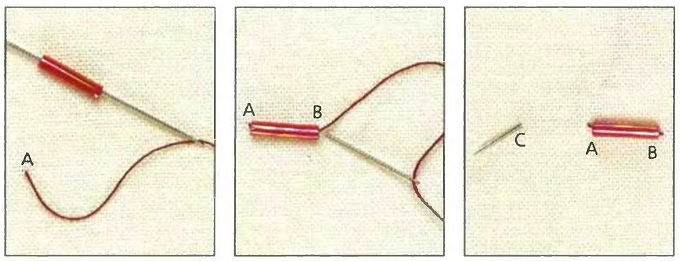 3. Нить затягивается, иголка выводится на лицевую сторону работы, в точке С. Промежуток между точками С и А составляет длину одного стекляруса.