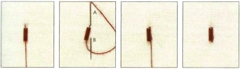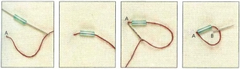 4. Нить слегка натягивается и проводится на лицевую часть работы в точке В. Игла при этом проходит между концом цилиндра и петлей (промежуток между точками А и В составляет длину одного цилиндрика).