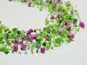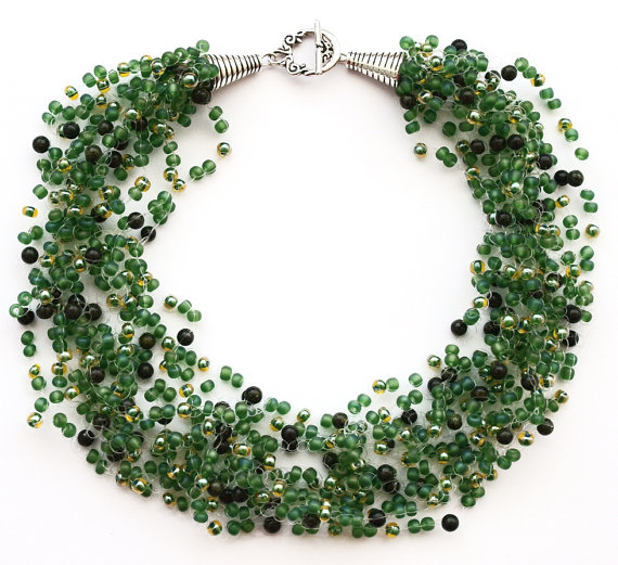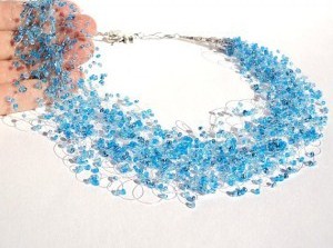 Оно смотрится просто роскошно. Такой аксессуар одинаково хорошо подойдет и к открытым нарядам с декольте, и к закрытым блузкам и водолазкам. Изготовить такое украшение абсолютно несложно: достаточно уметь плести крючком. При этом в ход идут любые бусины и бисер, которые нанизываются в хаотичной последовательности. Поэтому одним из главных преимуществ такого аксессуара является то, что его можно сплести даже из остатков бисера, накопившегося у вас дома. Цвет такого колье вы выбираете какой угодно, в соответствии с нарядами, с которыми будете его надевать. Для лета замечательно подойдет как белые, так и цветные однотонные или разноцветные ожерелья, переливающиеся на солнце.