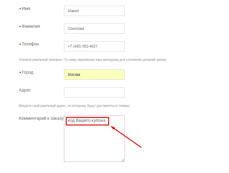 Для того чтобы применить купон, Вам необходимо при оформлении заказа указать код купона в поле «Комментарий к заказу»: